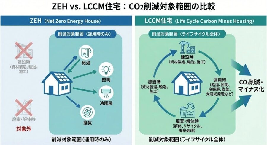 ZEHはあくまで「居住中」にフォーカスしていますが、LCCM住宅は「家の一生」を見据えています。