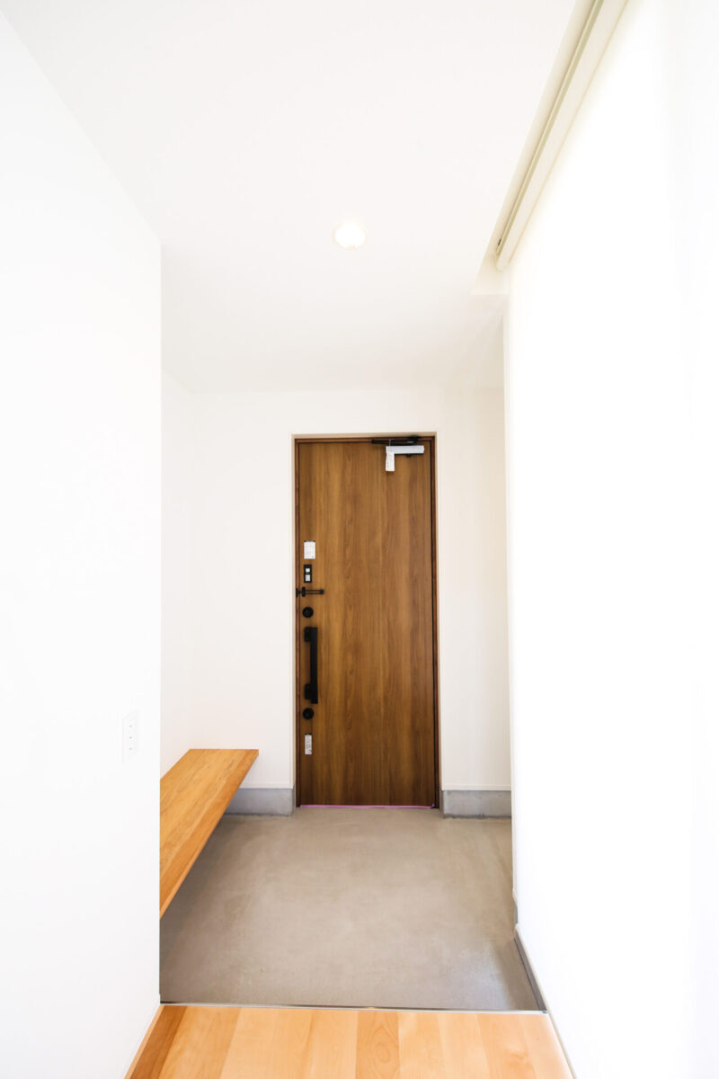 純白の外壁と木目のコントラストが美しい玄関。暮らす人の様子を想像させないシンプルな造りです。