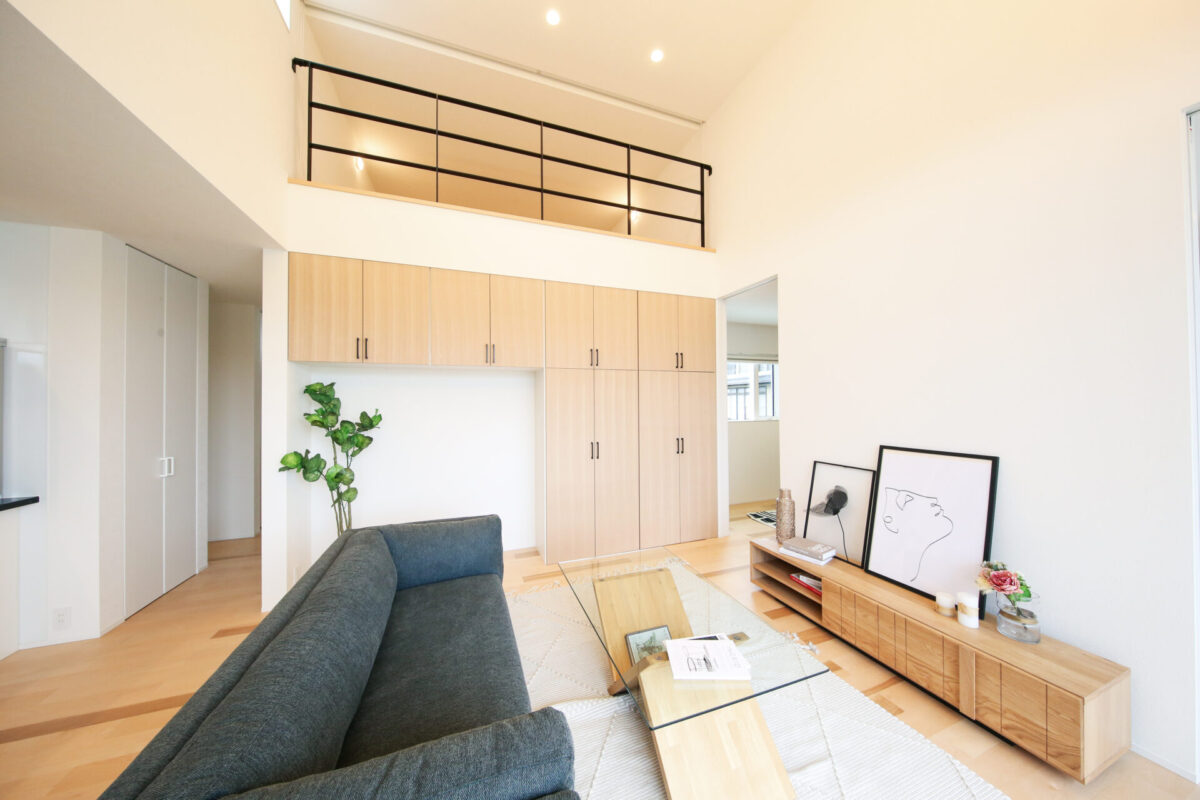 平家の住宅に奥行きと自然な明かりをもたらす、注文住宅らしい自由なデザイン。高い天井とロフトが広々とした開放感を実現します。
