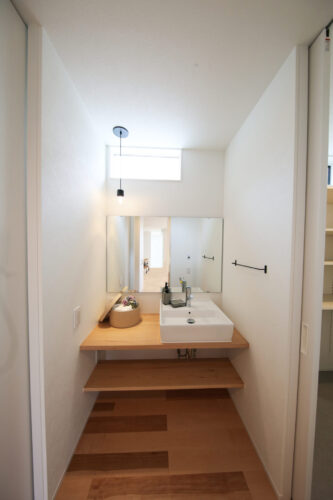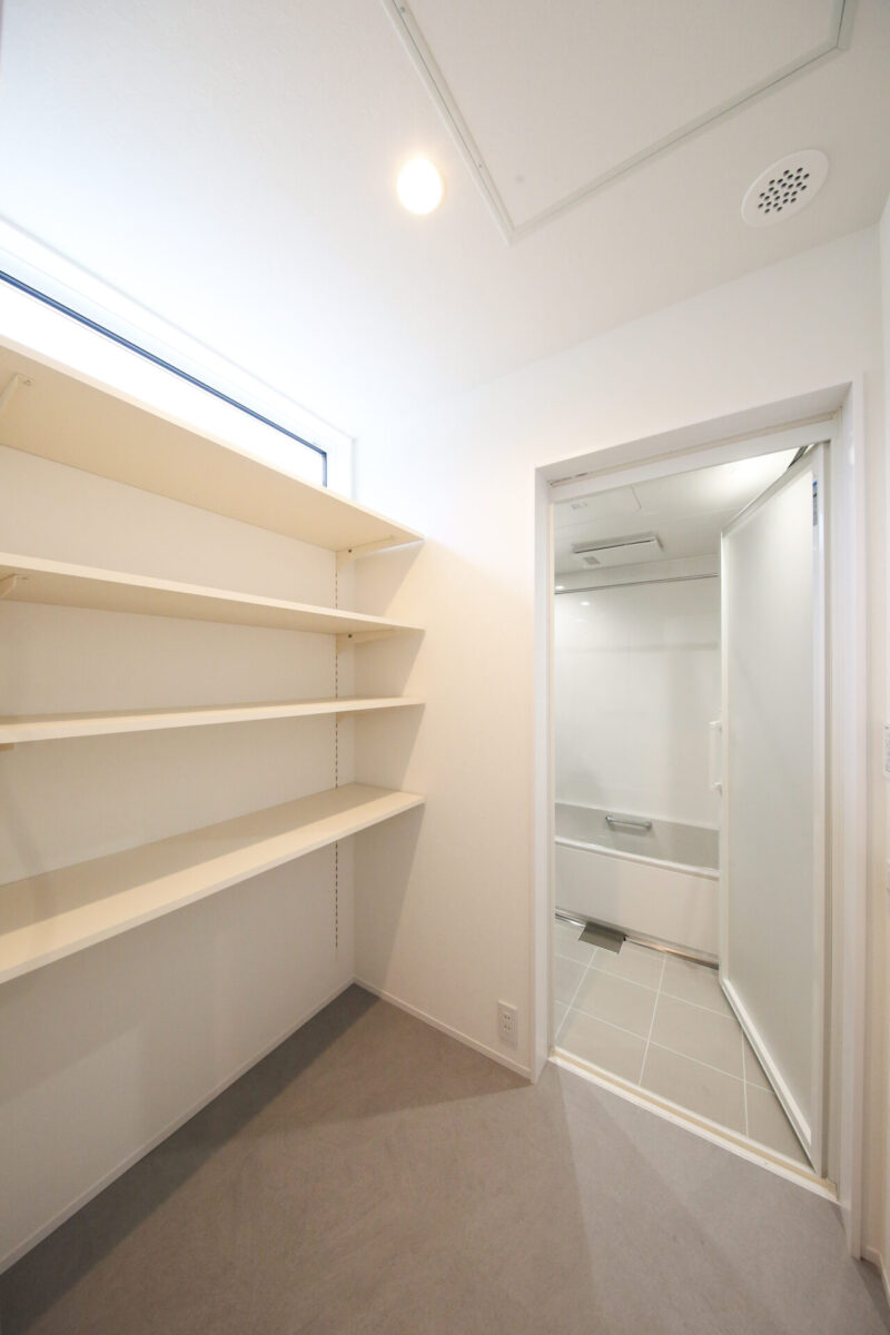 横長の上窓から自然光をたっぷりと取り込み、明るく清潔感のある脱衣所。 外からの視線を気にせずに過ごせる、安心の設計です。