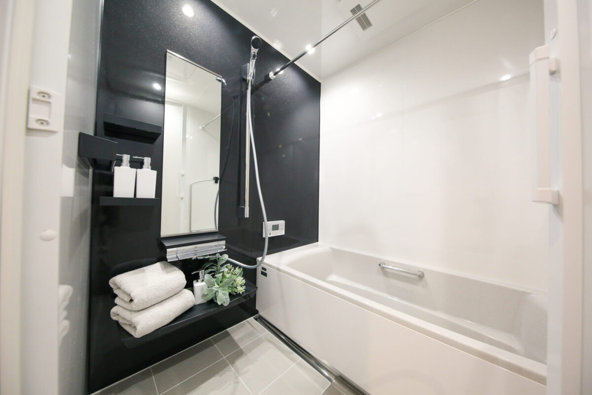 ゆったりとした広い浴槽で1日の疲れを癒やせる浴室。黒のアクセントウォールが視覚的な変化を加え、空間に深みを与えます。
