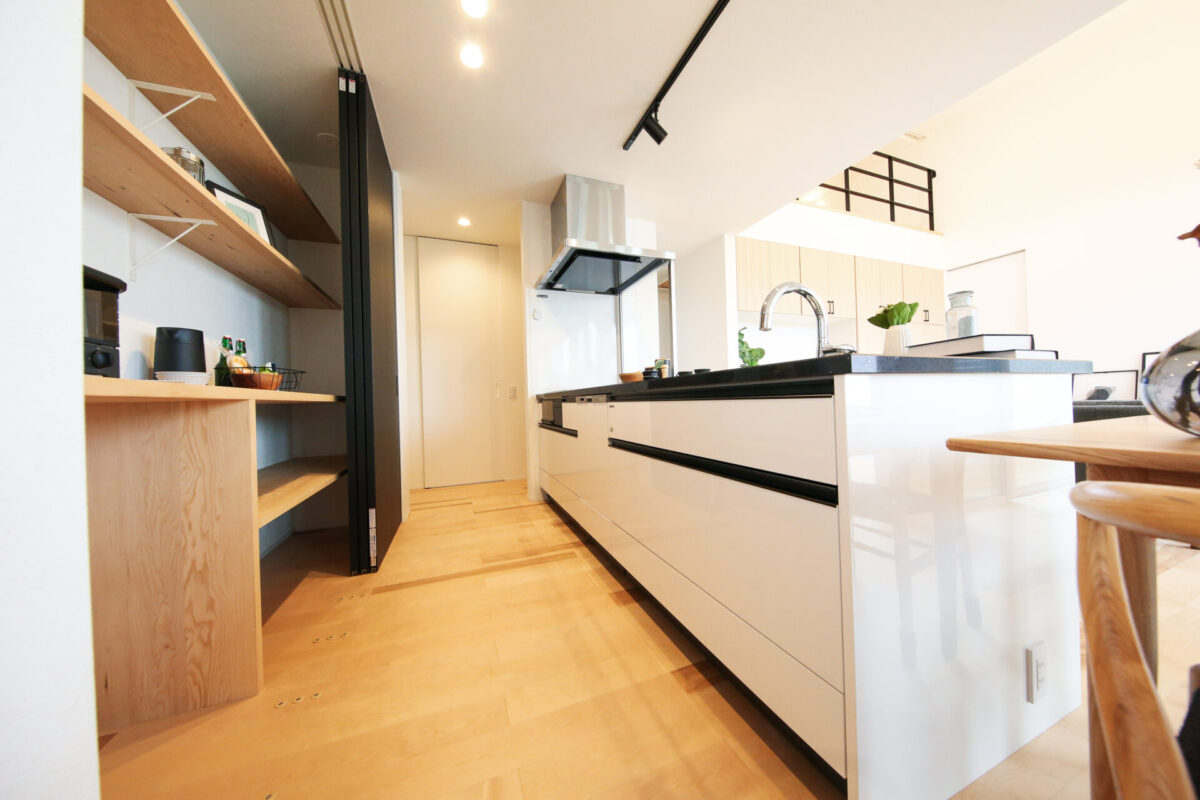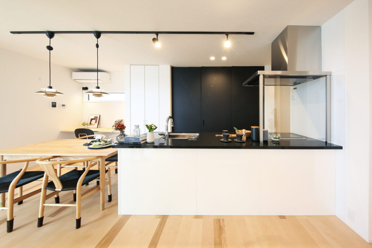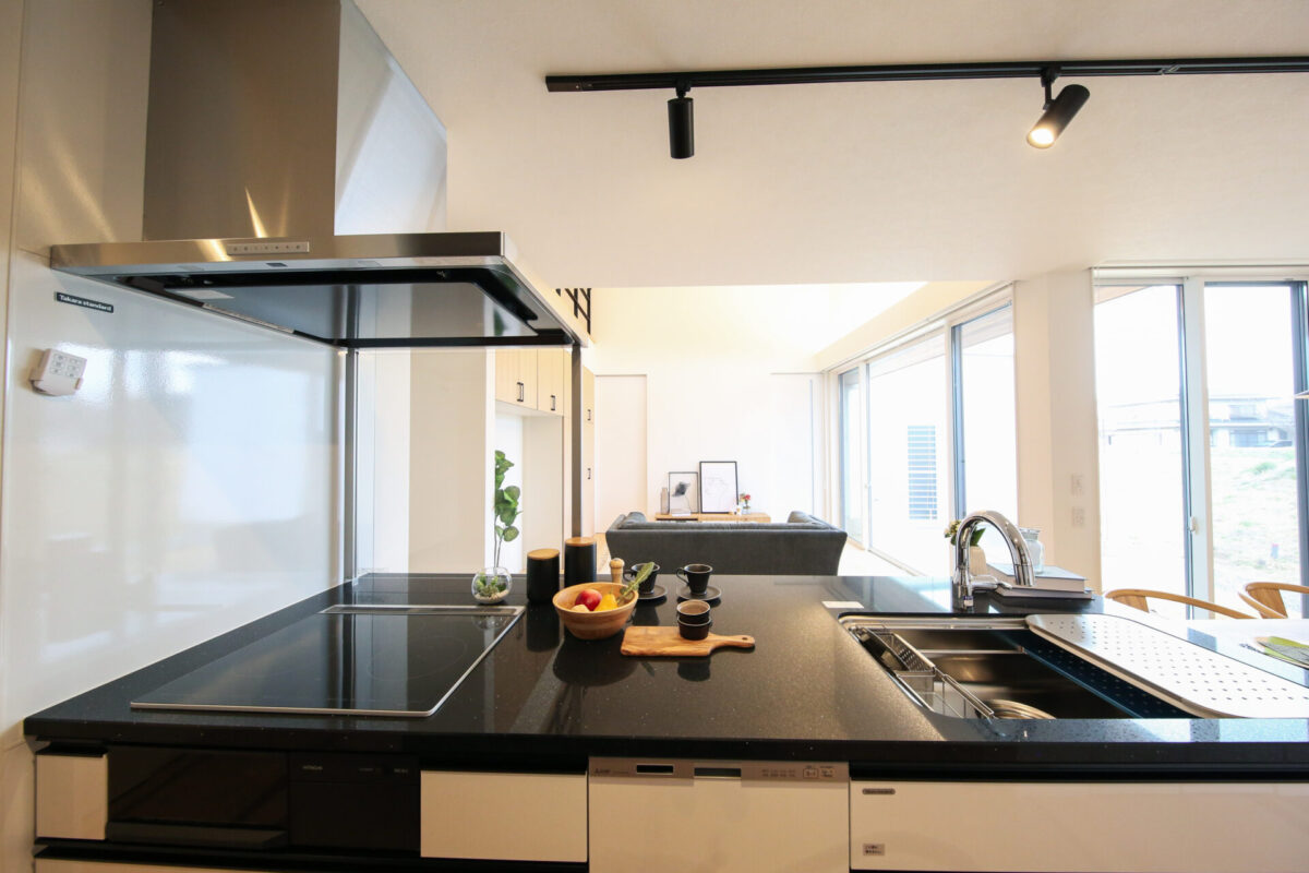 リビングで過ごす家族やゲストの様子を眺められる、一体感のある開放的な空間。調理中も自然とコミュニケーションが生まれます。