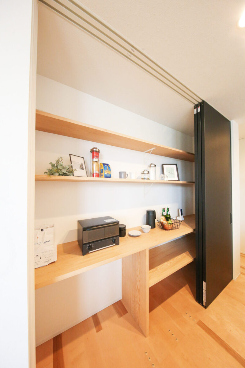 カウンター裏に設けられた扉付きのキッチン収納。家電や調理器具などが簡単に隠せる便利な設計です。