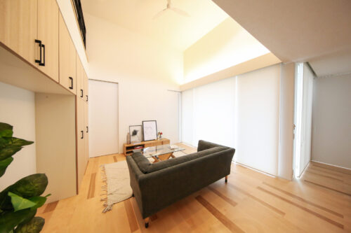 中庭に繋がる大きな窓が心地よい開放的なリビングルーム。プライバシーの確保と自然との繋がりを両立させた間取りです。
