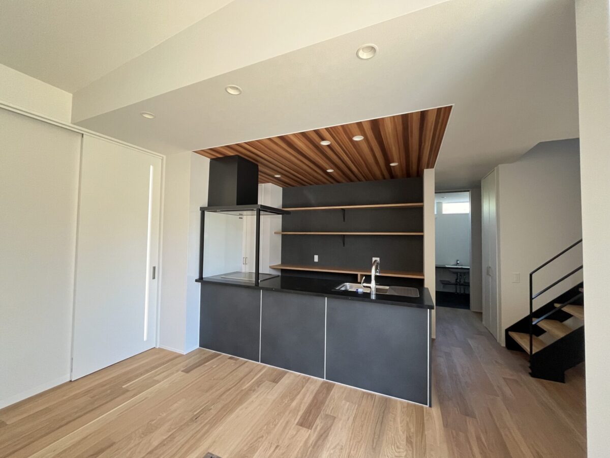 黒いインテリアが空間を引き締める、上品なデザインのペニンシュラキッチン。 家族との会話が自然と増える、開放的な設計です。