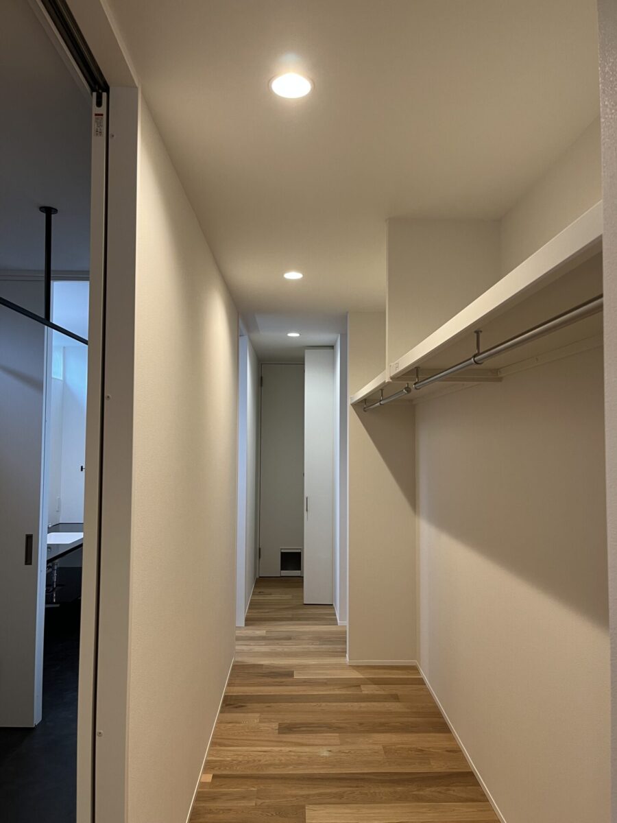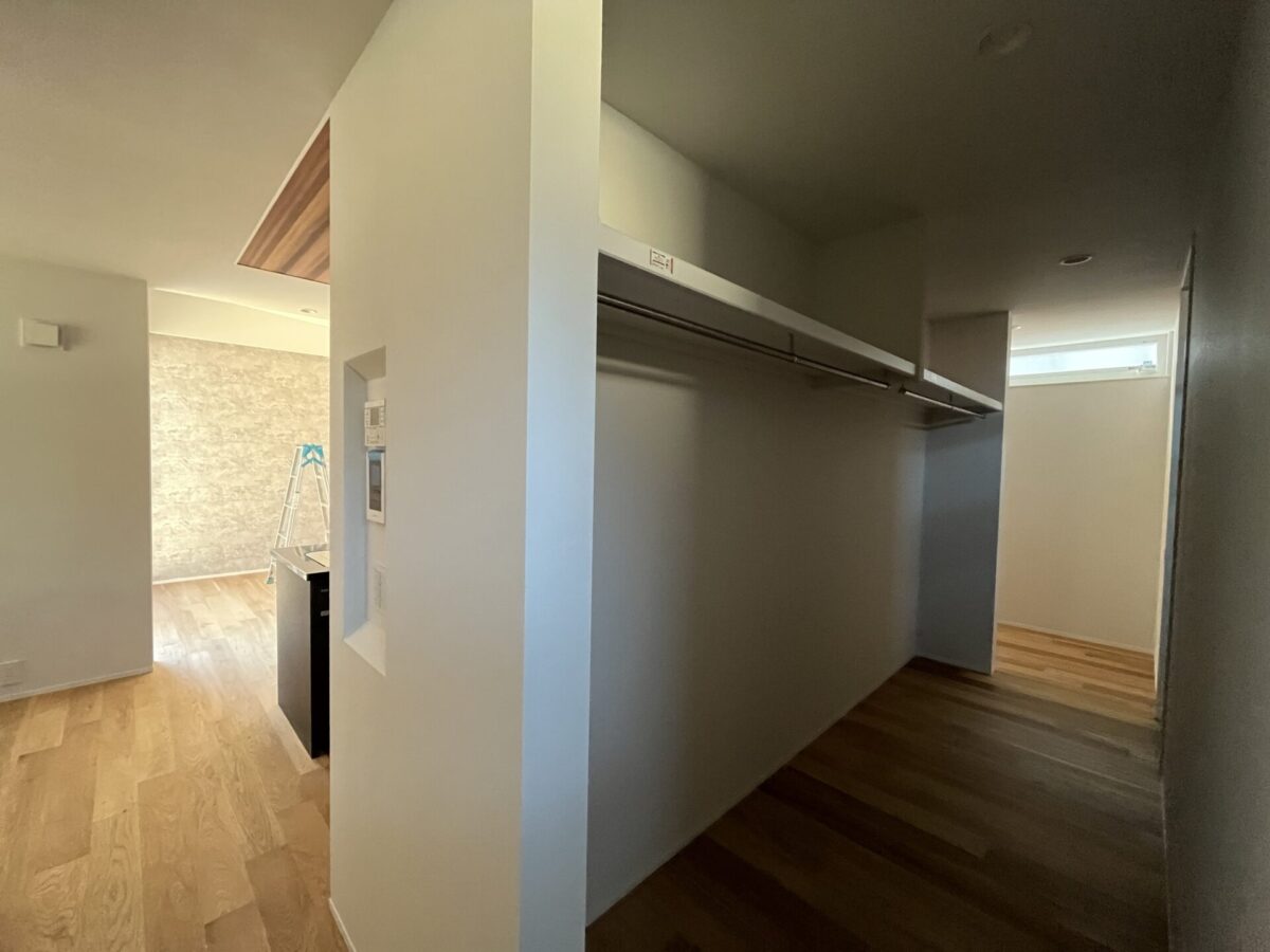 広々とした使いやすいウォークインクローゼット。両面にウォールシェルフが設けられています。
