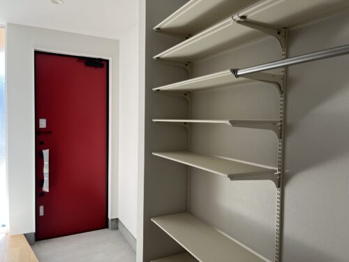 白い壁と木目のシンプルなデザインの中に赤いドアが映える、個性的でモダンな玄関。 実用的な土間収納が備わった、こだわりの設計です。