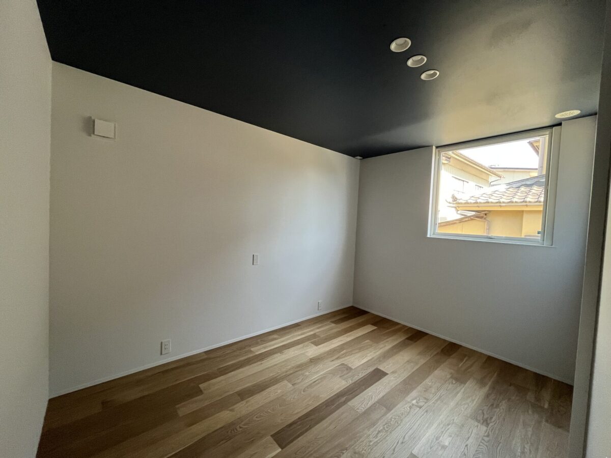 黒い天井がアクセントになった、使いやすさと美しさを両立させた洋室。 家族構成の変化にも柔軟に対応できるシンプルなデザインです。