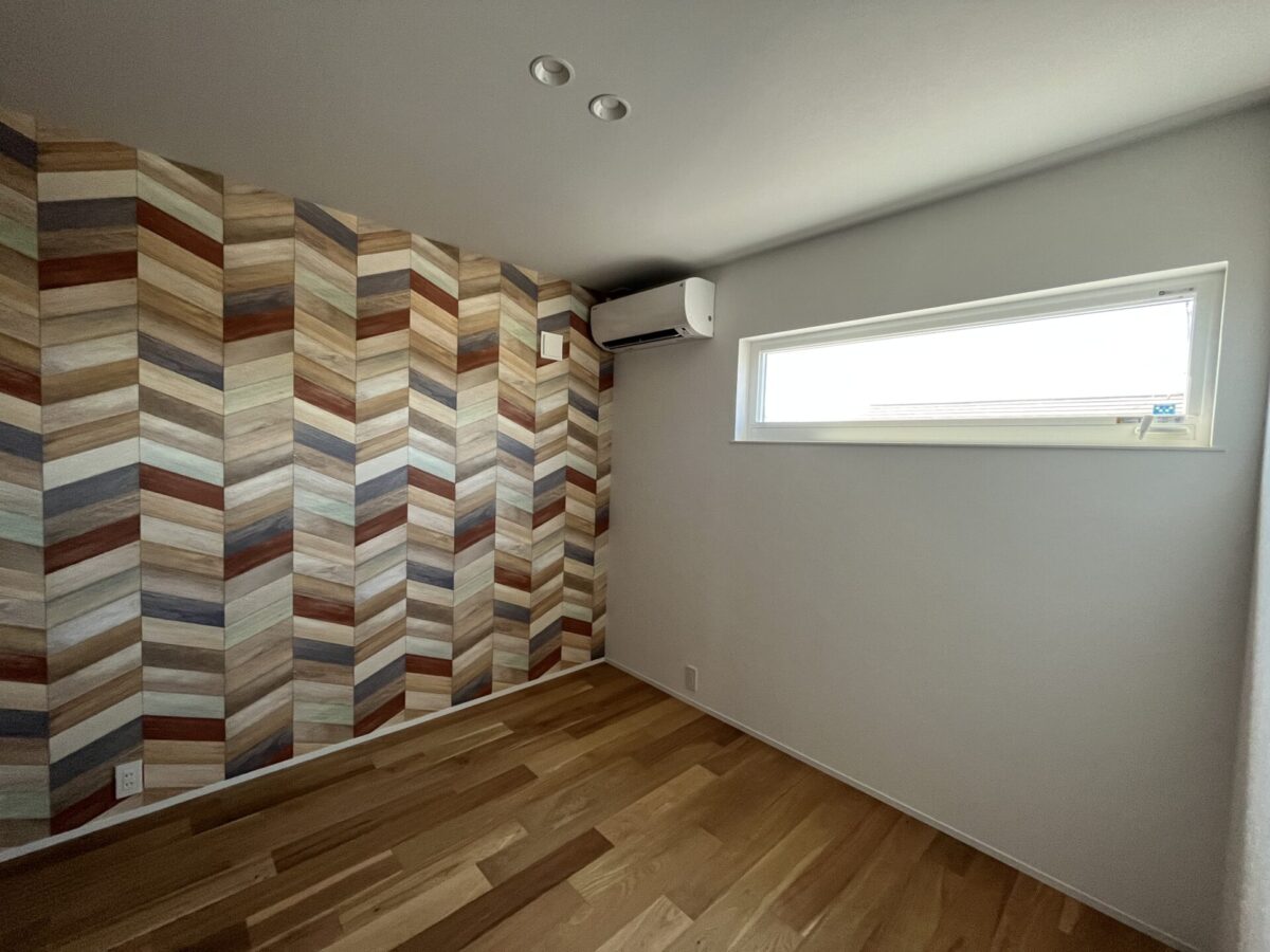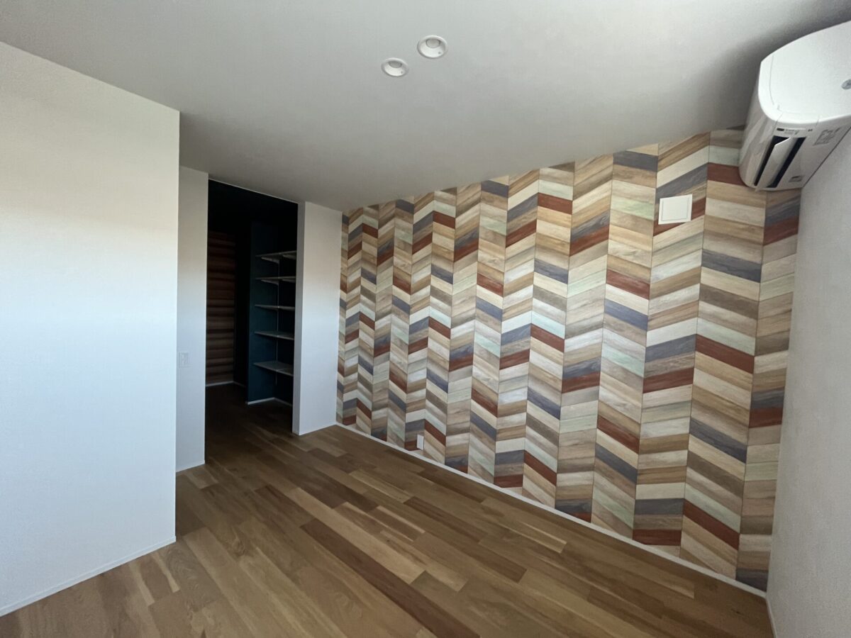 ヘリンボーン張りのアクセントウォールが特徴的な内装。 注文住宅ならではの工夫を凝らしたデザインです。
