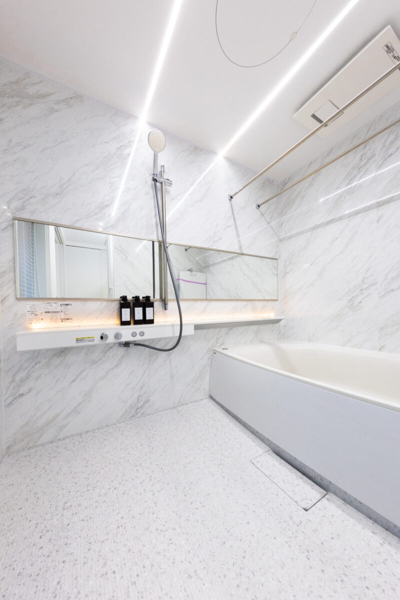 注文住宅ならではの個性的で透明感のあるデザイン。広いバスタブと柔らかな照明が癒しの時間を提供します。