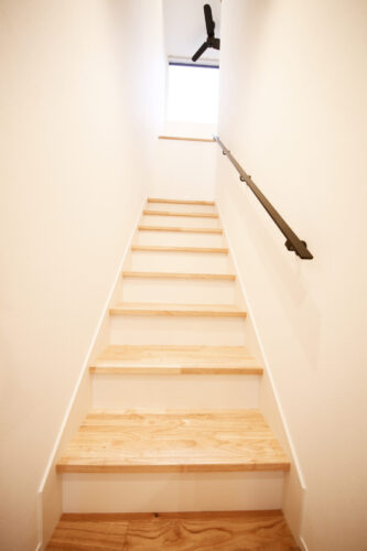 大きな窓から光が差し込む階段。階段には箱階段を採用し、収納スペースを確保しています。
