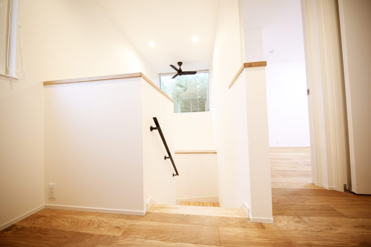 収納量を考えた間取りの為、階段は階段下収納がフルで取れるように箱階段を採用。すっきりとした壁面デザインを作るためにリビングのエアコンは天カセタイプのものを設置しました。