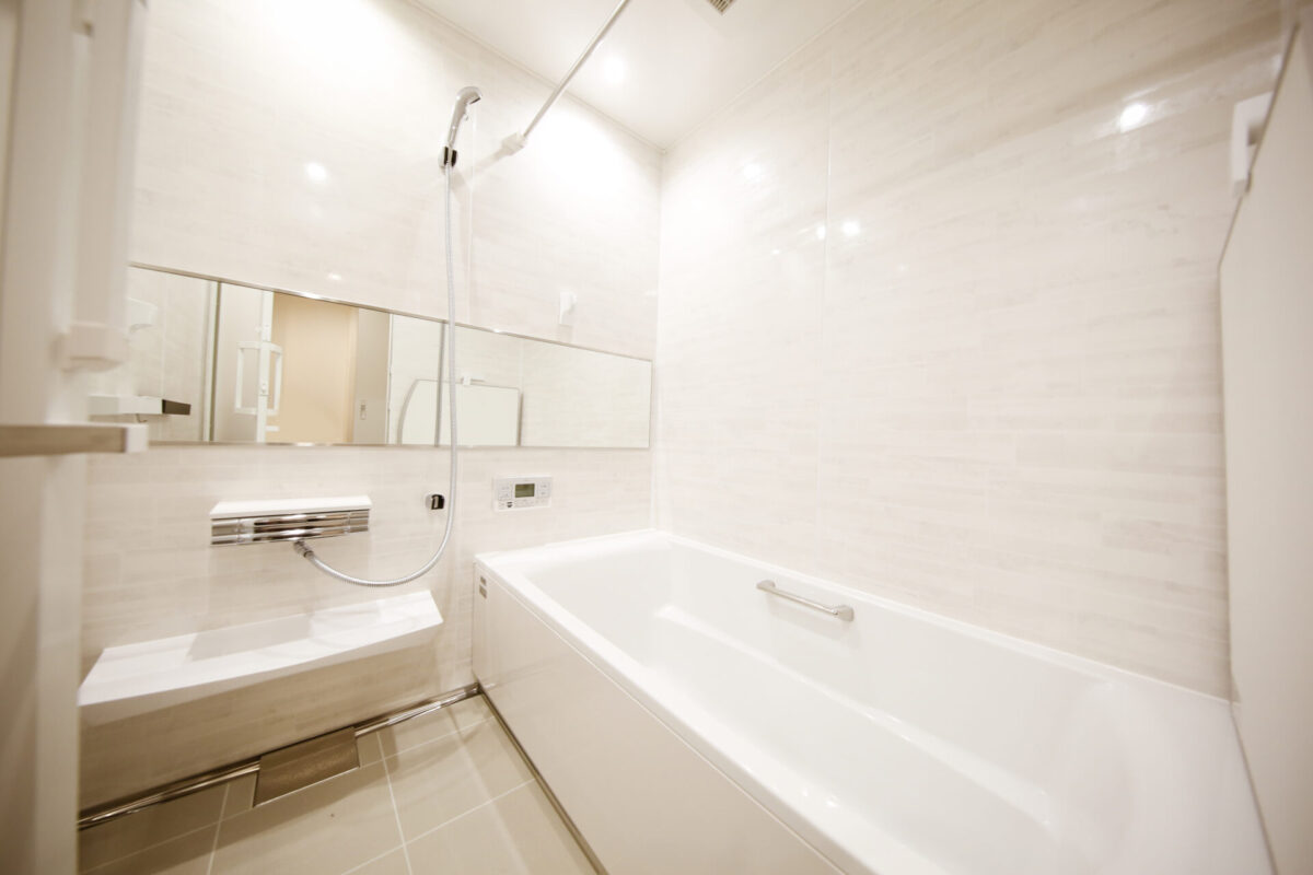 大きな鏡が備え付けられた清潔感のある浴室。広々した造りの浴槽は、1日の疲れを癒すのに最適です。