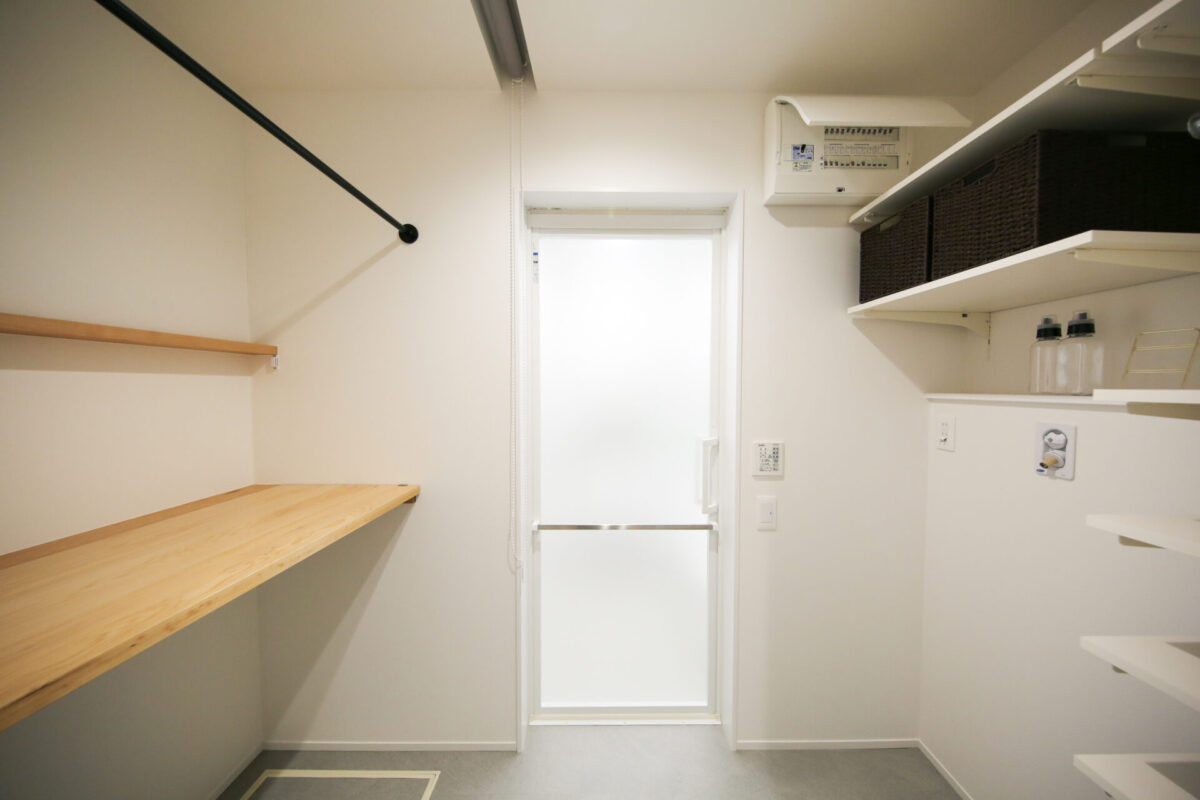 ウォールシェルフやハンガーポールが備え付けられた、機能性に優れる脱衣所。考え抜かれた動線が洗濯に必要な移動を減らします。