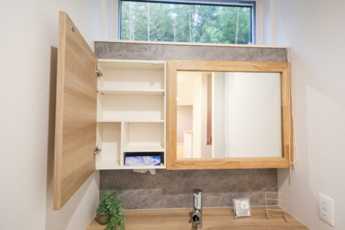 散らかりやすい水回りも、すっきりと整えられる造作洗面台収納。片付けやすく清潔感のある、暮らしに寄り添った設計です。