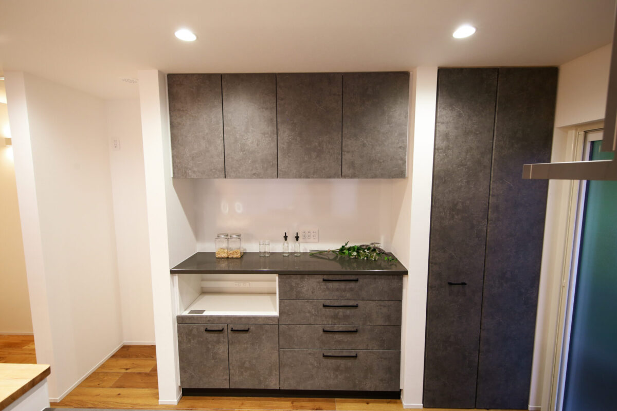 カウンター裏に取り付けられた大容量のキッチン収納。デザイン性と機能性に優れた、見せない収納です。