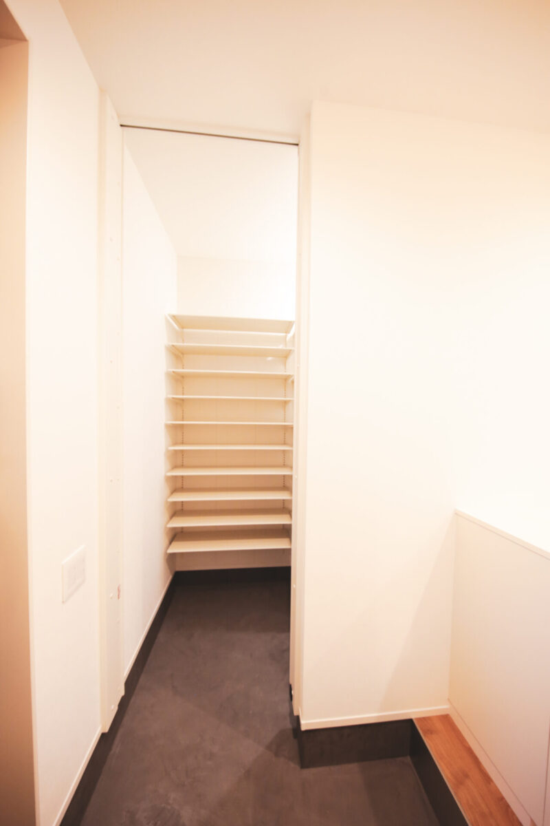 使用頻度の高いアイテムや季節物をすっきり収納できる、便利なヌック下の収納。限られたスペースを余すことなく活用する設計です。