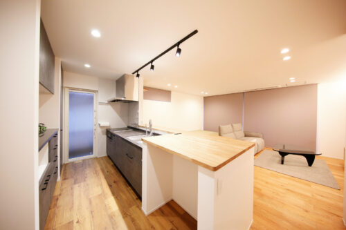 グレーを基調とした落ち着いたデザインのキッチン。調理をしているとリビングの様子が自然と目に入ります。